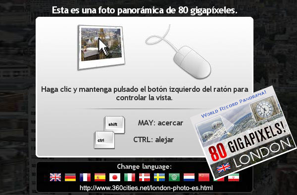 El portal 360cities publica fotos panorámicas aportadas por los propios usuarios, tú también puedes unirte, agregar la tuya y beneficiarte de las ventajas que la web ofrece. La foto esférica que vemos aquí es de la ciudad de Londres y parece ser que es la imagen panorámica más grande que se ha hecho hasta el momento (80 Gigapíxeles). Ir a la foto.